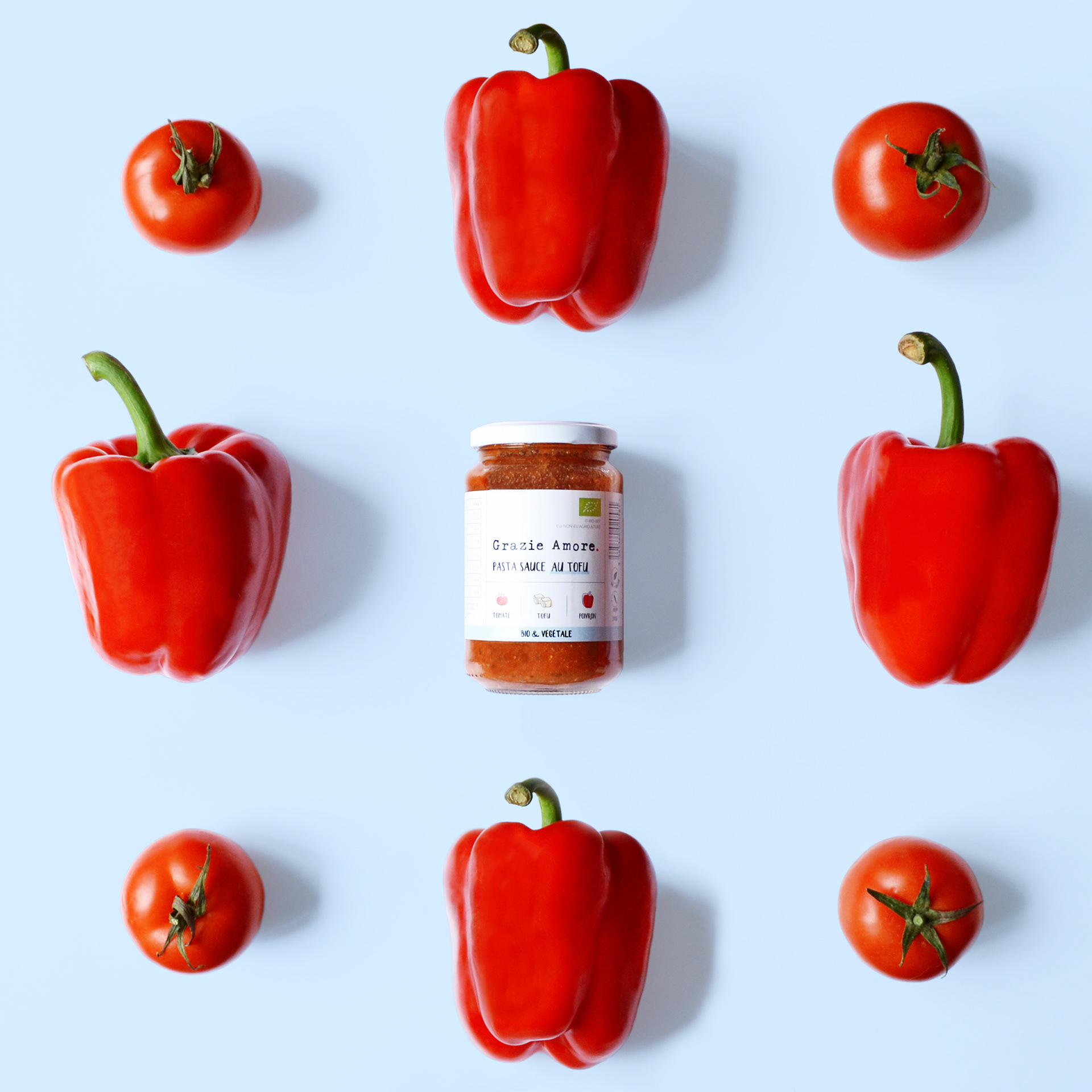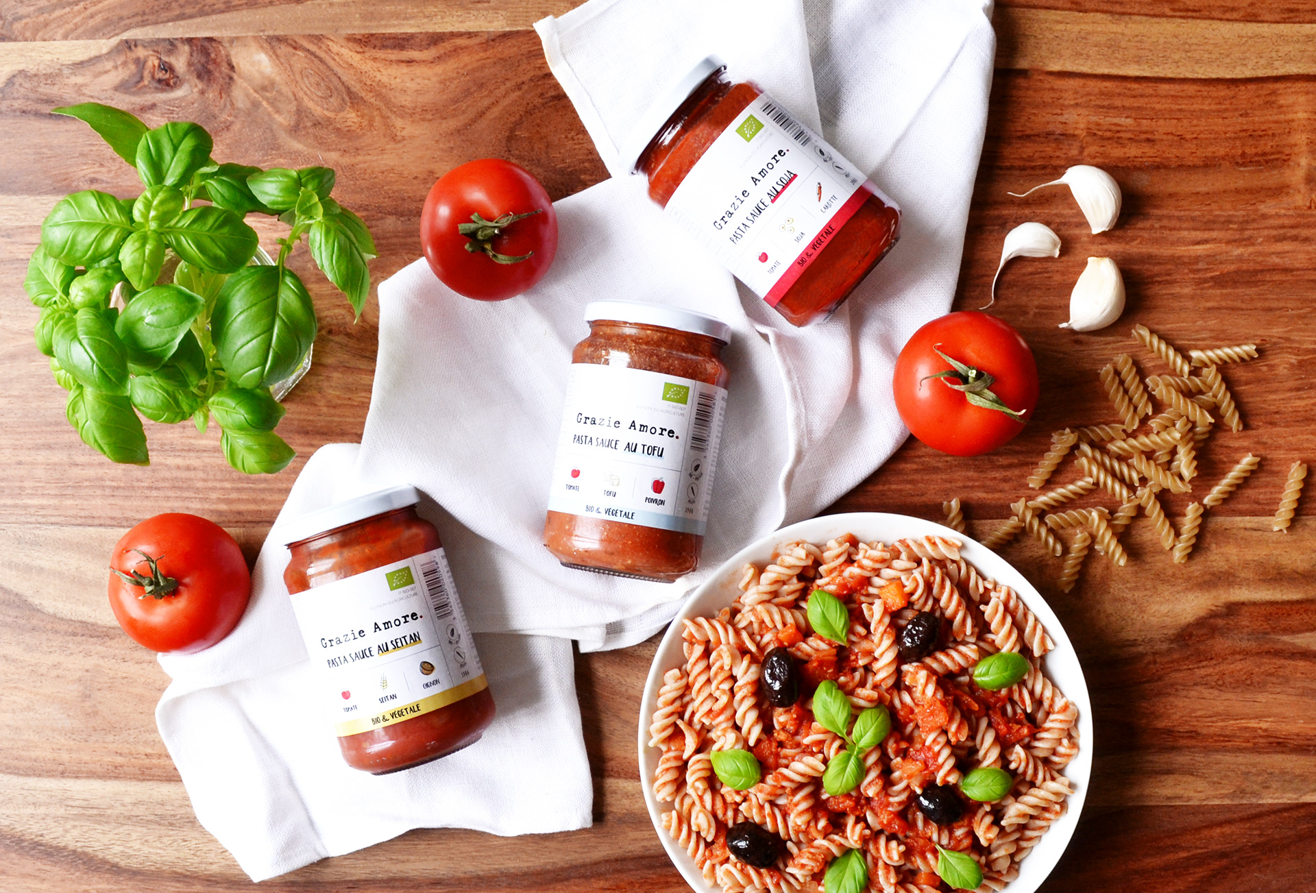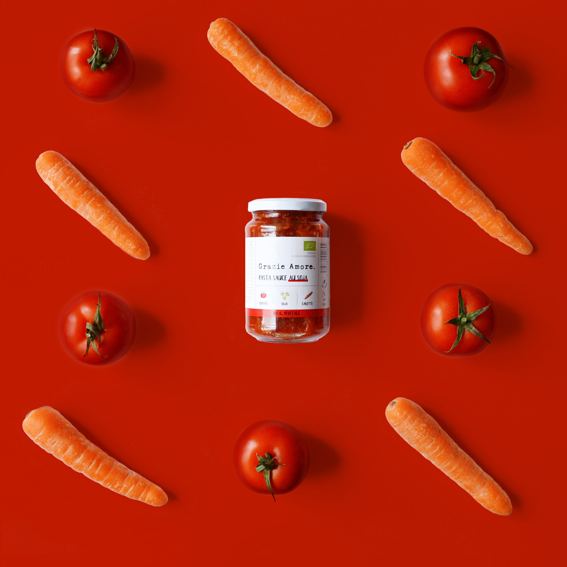 Identité visuelle et packaging pour une marque de sauce pour pâte bio et végane vendu chez Naturalia en France.